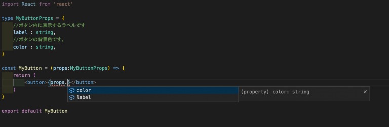 props. と打つと、VSCodeが候補(label、Color)を出してくれます。