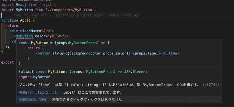 TypeScriptさん:「MyButtonPropsのcolorの宣言に?をつけるだけやで」