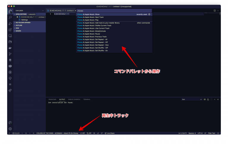 このプラグインを利用すると、VSCodeのコマンドパレットからiTunesを操作することができます
